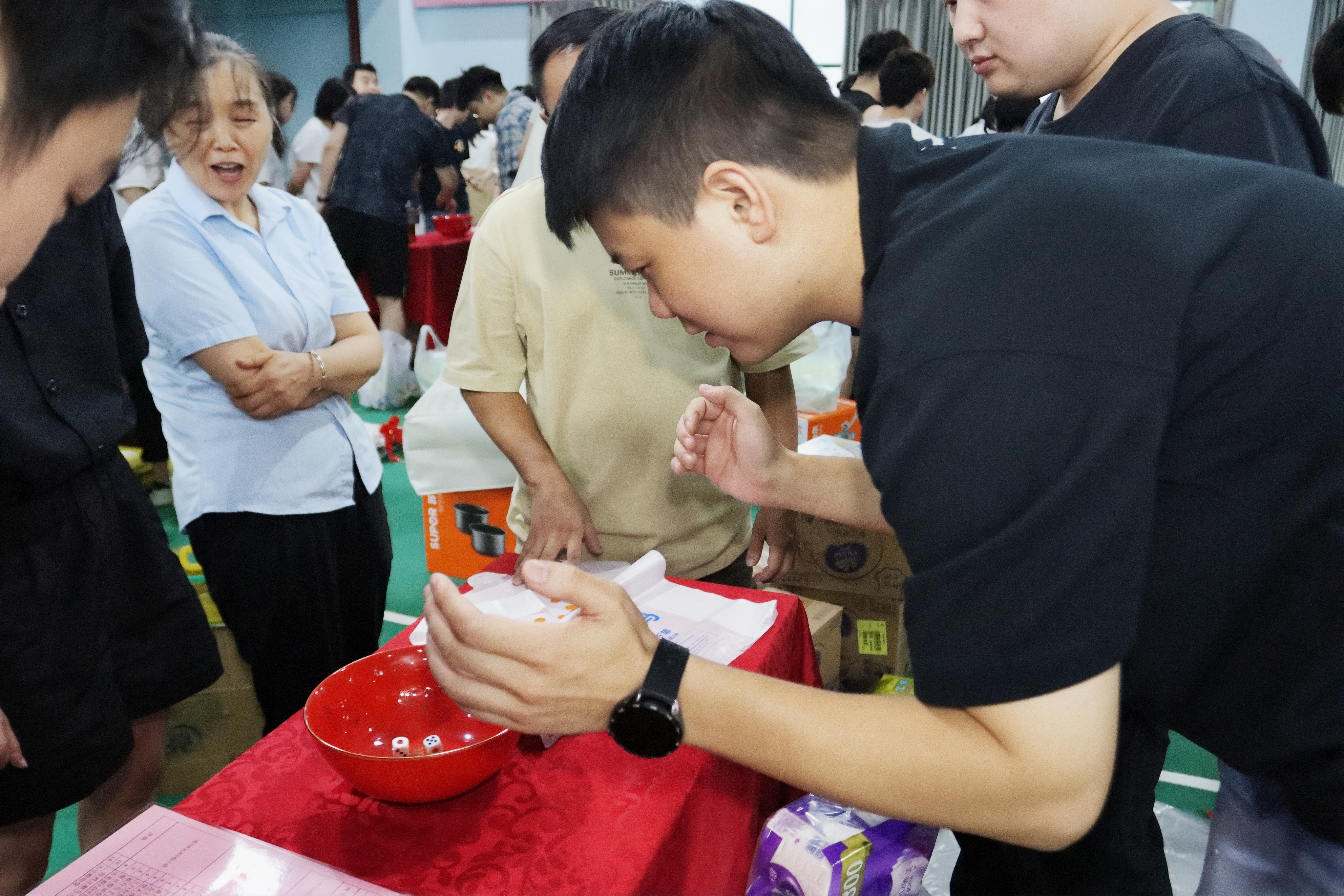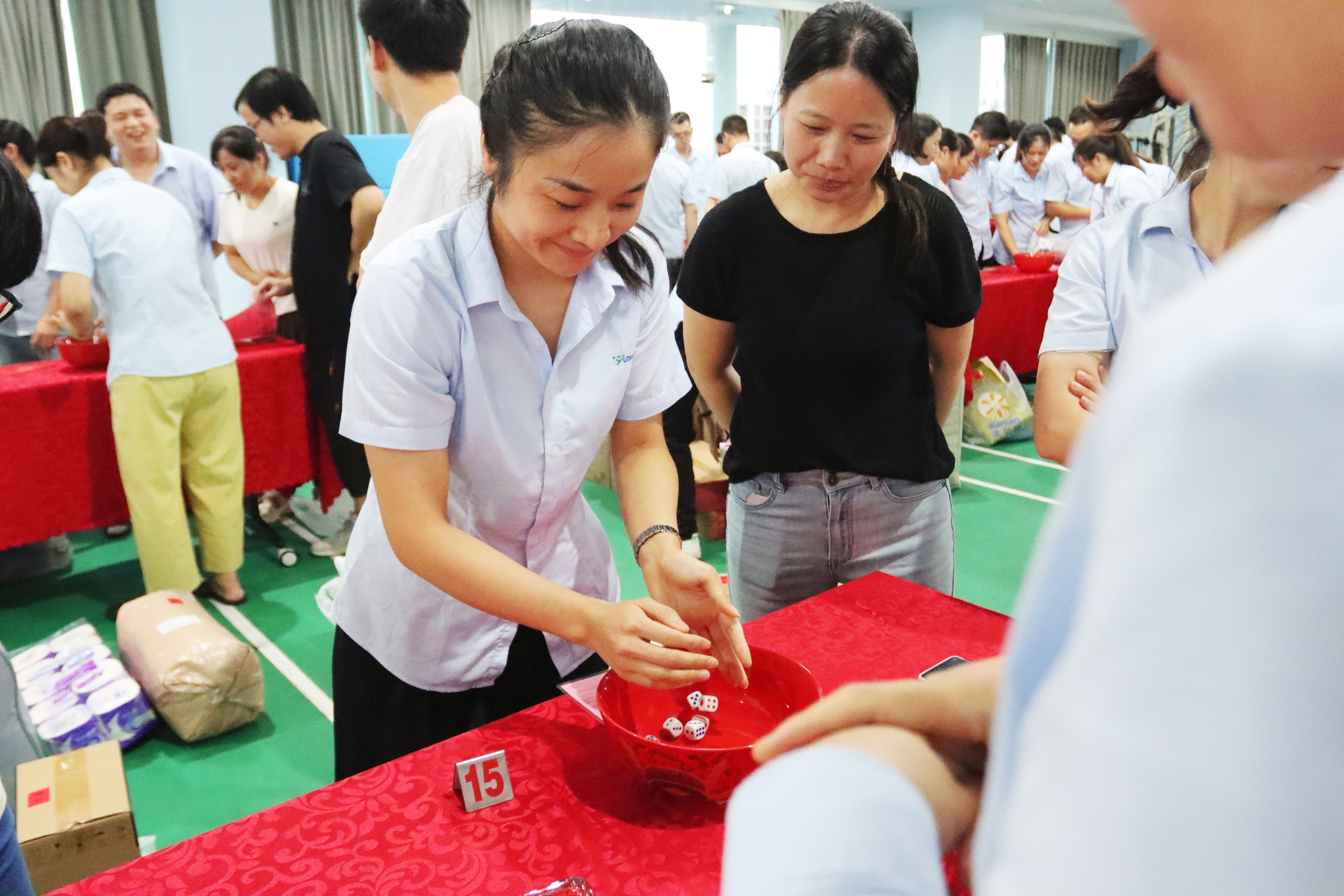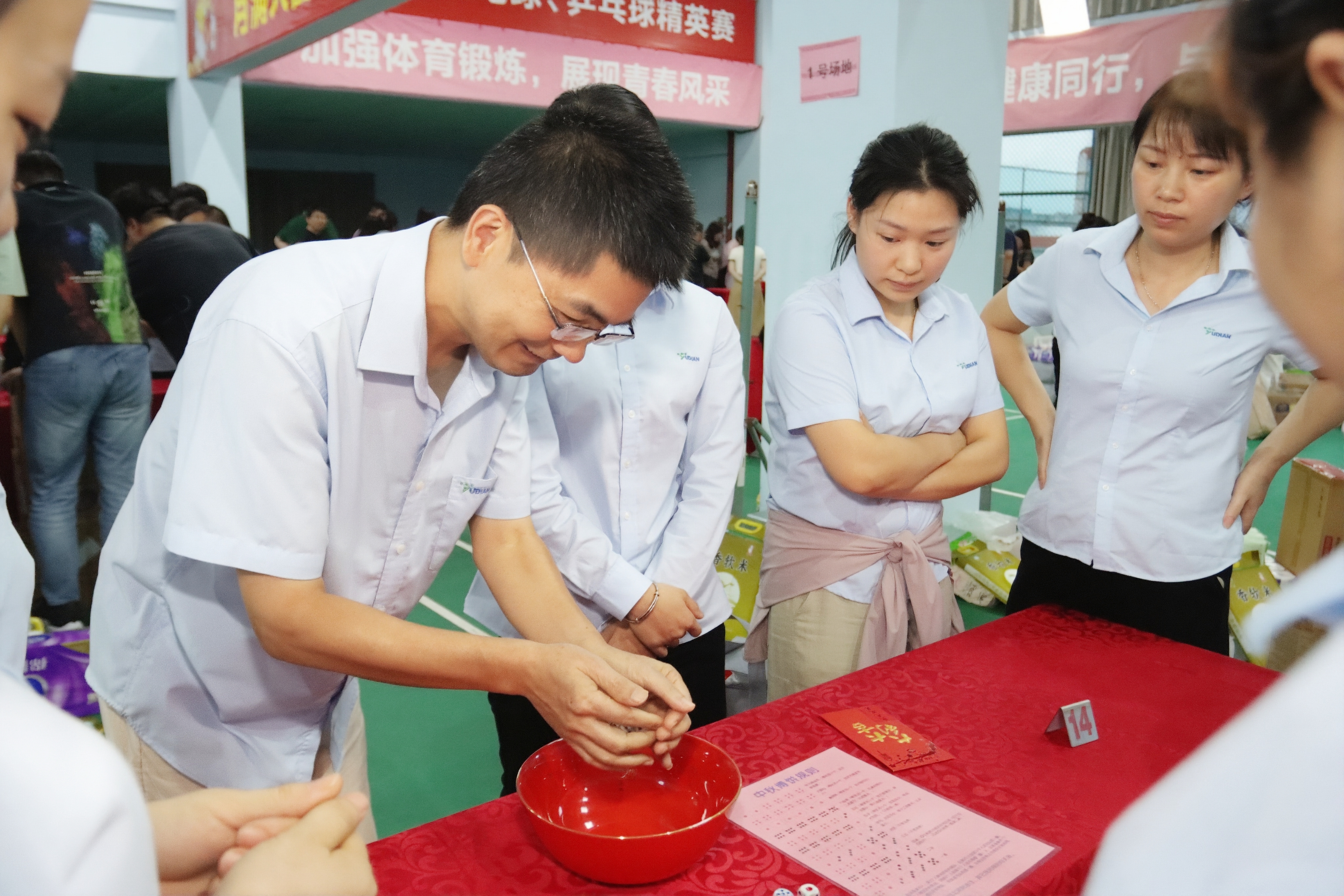 活動現(xiàn)場,骰子在紅碗中清脆滾動,喝彩聲與歡笑聲交織成最動人的樂章。宇電人暫別工作的專注,全身心投入這場歡樂盛宴:有人為一擲中的而驚喜雀躍,有人因團隊互動而暖意融融。在博餅的一收一放間,不僅是獎品的傳遞,更是宇電人彼此聯(lián)結(jié)的紐帶在悄然加固,團隊的凝聚力與歸屬感,在這濃濃的節(jié)日氛圍里悄然升華。